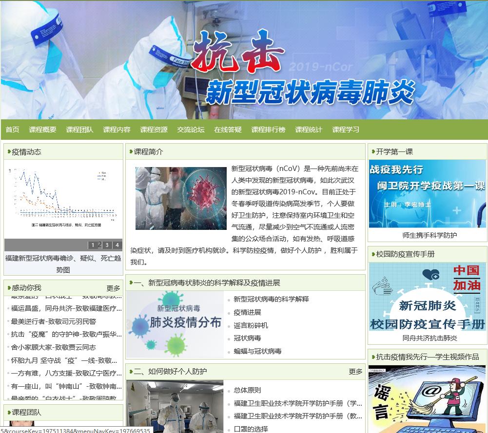 為貫徹落實教育部“課程學習與疫情防控知識學習相結合,特別注重疫情防護知識普及,加強生命教育、公共安全教育和心理健康教育”工作指示,福建衛(wèi)生職業(yè)技術學院管理系黨總支第一黨支部教師黨員聯(lián)合預防醫(yī)學教研室,利用預防醫(yī)學專業(yè)優(yōu)勢,面向校內學生,在學院“天使之城”學習空間開設《抗擊新型冠狀病毒肺炎》網(wǎng)絡課程。