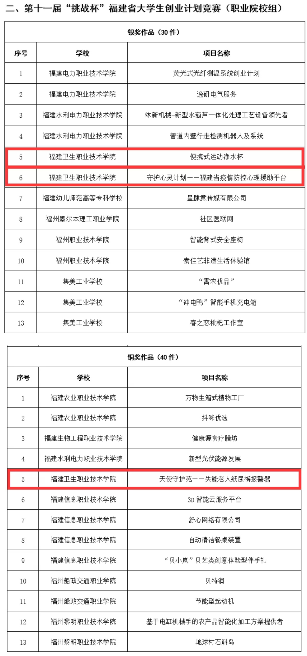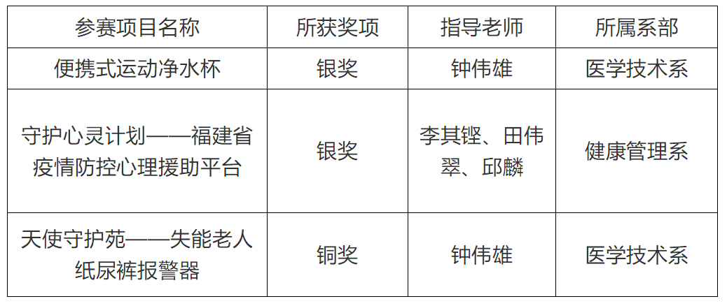 近日,第十一屆“挑戰(zhàn)杯”福建省大學(xué)生創(chuàng)業(yè)計(jì)劃競(jìng)賽決賽在云端開賽。福建衛(wèi)生職業(yè)技術(shù)學(xué)院參賽項(xiàng)目 “便攜式運(yùn)動(dòng)凈水杯”、 “守護(hù)心靈計(jì)劃——福建省疫情防控心理援助平臺(tái)”獲得銀獎(jiǎng),“天使守護(hù)苑——失能老人紙尿褲報(bào)警器”獲得銅獎(jiǎng)。