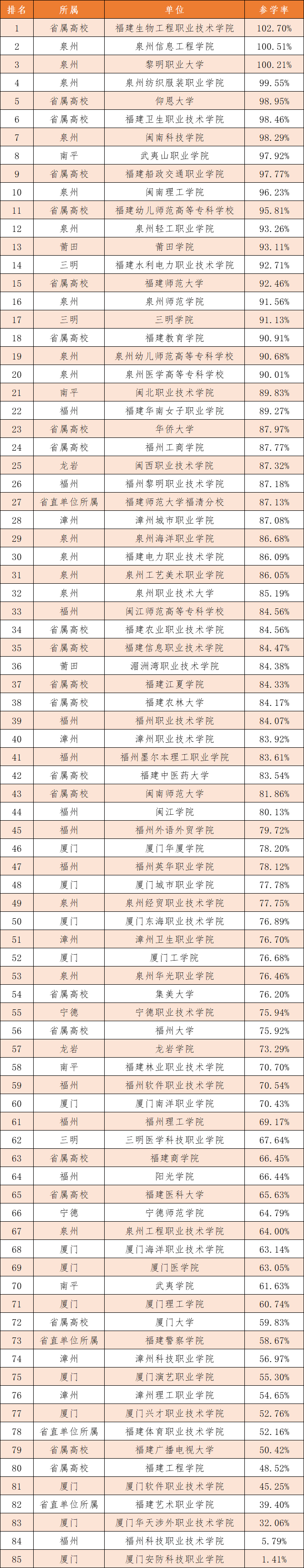 第十季第一期“青年大學(xué)習(xí)”網(wǎng)上主題團(tuán)課,高校團(tuán)委中共有44所學(xué)校參學(xué)率達(dá)到80%,對(duì)以下各高校的團(tuán)組織提出表?yè)P(yáng):福建生物工程職業(yè)學(xué)院本周102.70%參學(xué)率獲得第一名,參學(xué)率最高。泉州信息工程學(xué)院獲得第二名。排名第三至第五名分別泉黎明職業(yè)大學(xué)、泉州紡織服裝職業(yè)學(xué)院、仰恩大學(xué),排名第六名至第十名為福建衛(wèi)生職業(yè)技術(shù)學(xué)院、閩南科技學(xué)院、武夷山職業(yè)學(xué)院、福建船政交通職業(yè)學(xué)院、閩南理工學(xué)院