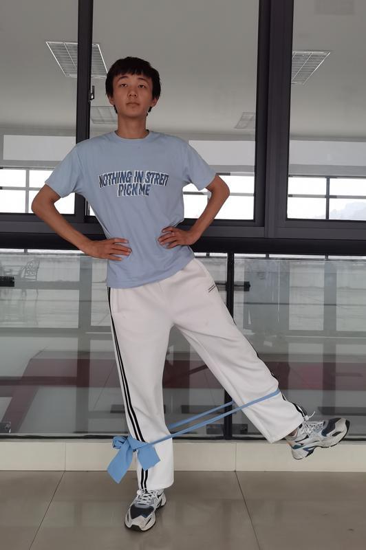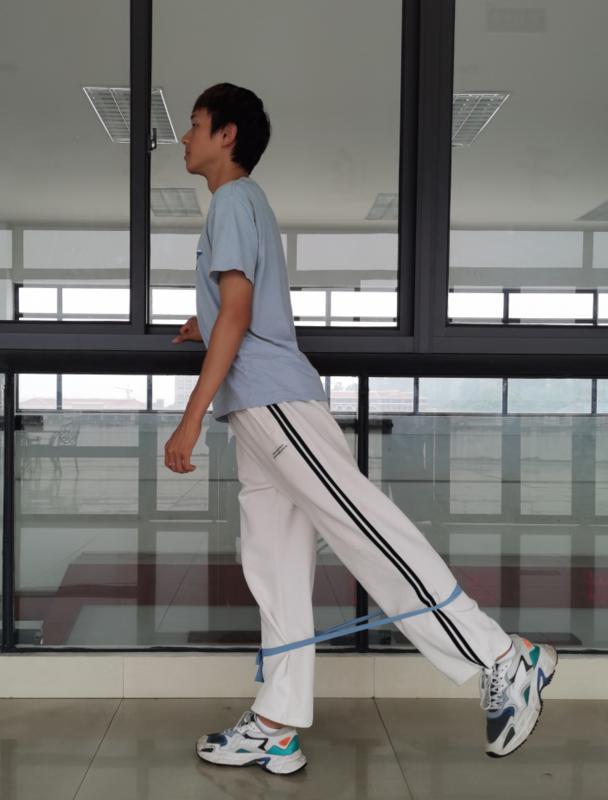 4.彈力帶后/側踢腿:主要鍛煉下肢肌群。將彈力帶綁成環(huán)狀,或使用彈力環(huán),固定在小腿上,一側手可扶墻保持穩(wěn)定。呼氣時,單側腿用力向后踢腿到極限位置,保持上半身穩(wěn)定,不要大幅度晃動;吸氣時還原,注意動作速度放慢,感受臀腿的發(fā)力感。