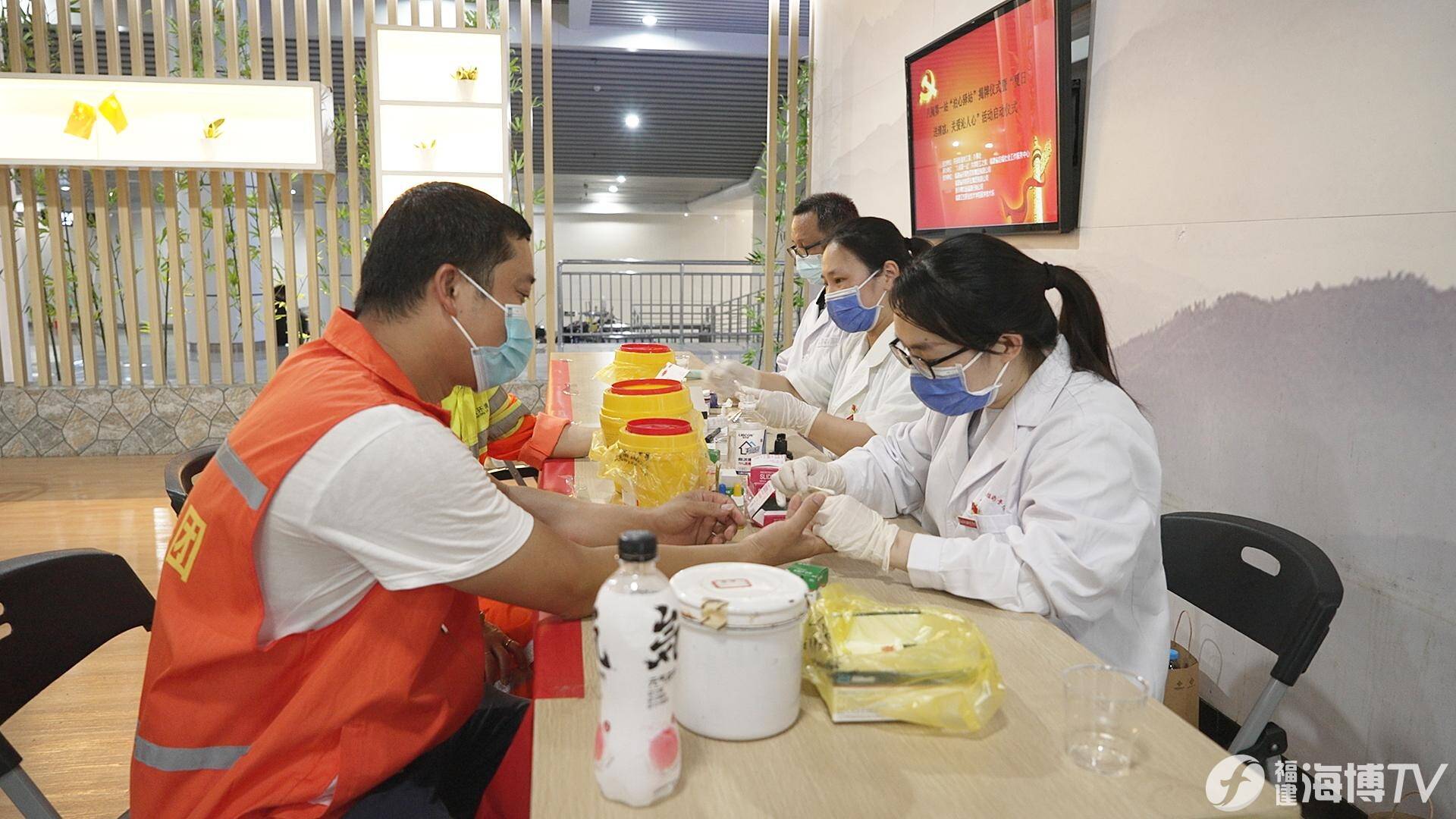 活動當天,正值火車站區(qū)域薪火黨建聯(lián)盟單位成員之一,福建衛(wèi)生職業(yè)技術(shù)學院醫(yī)學技術(shù)系提供輪值服務,師生們現(xiàn)場為參與活動的戶外工作者提供血型、血糖、乙肝抗體檢測等免費義診的服務。