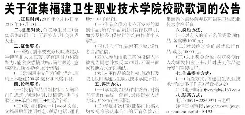 福建衛(wèi)生職業(yè)技術(shù)學(xué)院版權(quán)所有學(xué)院地址:福州市閩侯荊溪關(guān)口366號(郵編:350101)聯(lián)系電話:黨政辦公室 0591-22869917 招生就業(yè)辦公室 0591-22869955繼續(xù)教育學(xué)院 0591-22869959 閩ICP備05007543號 閩公網(wǎng)安備 35012102000005號