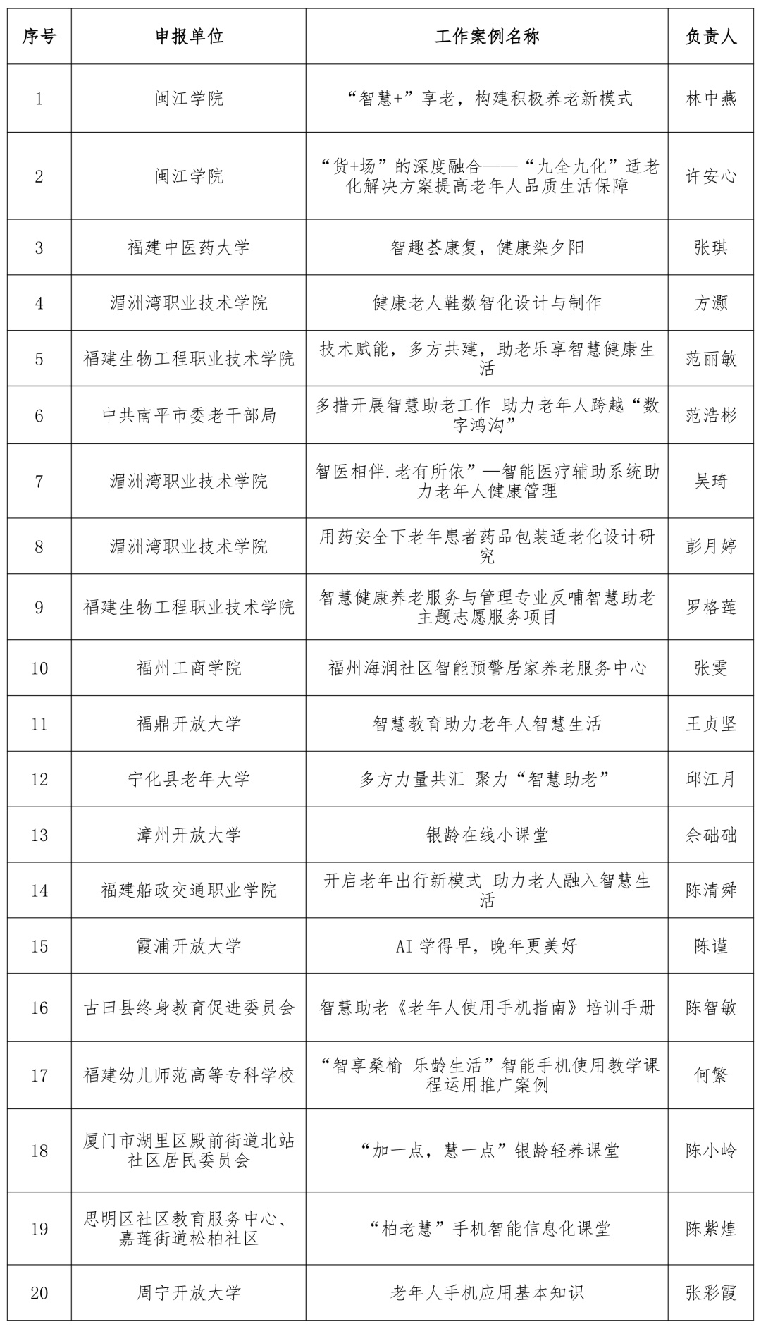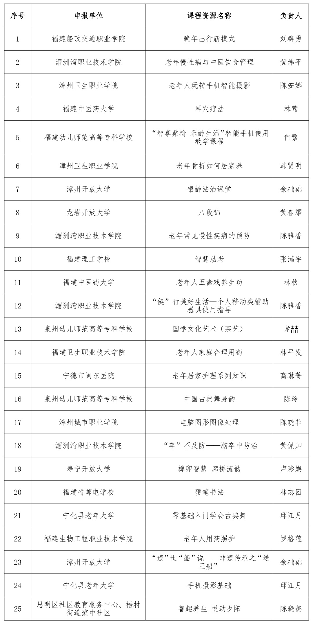 日前,福建省教育廳印發(fā)《關(guān)于公布2024年省級“智慧助老”優(yōu)質(zhì)工作案例和課程資源推介名單的通知》,將“‘智慧+’享老,構(gòu)建積極養(yǎng)老新模式”等20個優(yōu)質(zhì)工作案例、“晚年出行新模式”等25門優(yōu)質(zhì)課程資源推介為2024年省級“智慧助老”優(yōu)質(zhì)工作案例和優(yōu)質(zhì)課程資源。