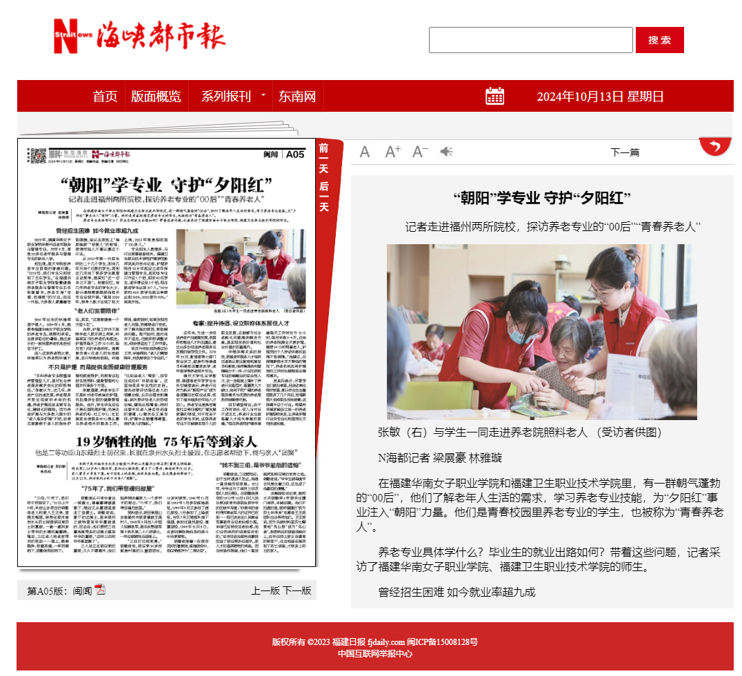 在福建華南女子職業(yè)學(xué)院和福建衛(wèi)生職業(yè)技術(shù)學(xué)院里,有一群朝氣蓬勃的“00后”,他們了解老年人生活的需求,學(xué)習(xí)養(yǎng)老專業(yè)技能,為“夕陽紅”事業(yè)注入“朝陽”力量。他們是青春校園里養(yǎng)老專業(yè)的學(xué)生,也被稱為“青春養(yǎng)老人”。