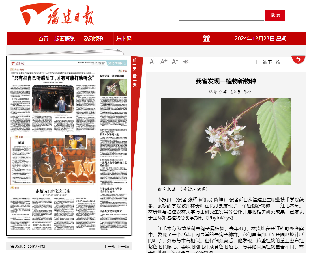 本報訊 (記者 張輝 通訊員 陳坤) 記者近日從福建衛(wèi)生職業(yè)技術(shù)學院獲悉,該校藥學院教師林貴燦在長汀縣發(fā)現(xiàn)了一個植物新物種——紅毛木莓。林貴燦與福建農(nóng)林大學博士研究生安昌等合作開展的相關(guān)研究成果,已發(fā)表于國際知名植物分類學期刊《PhytoKeys》。