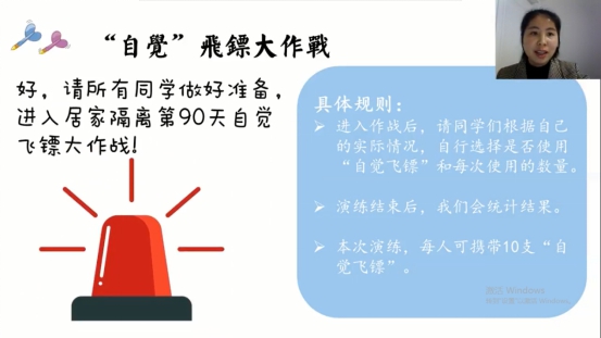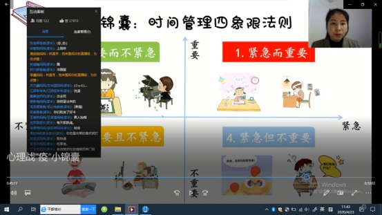 在學生的時間管理方面,夏雪梅老師首先通過“自覺飛鏢大作戰(zhàn)”的游戲,給各位同學們設(shè)置起床、專心做作業(yè)、認真聽網(wǎng)課等六個居家情境,來測試同學們的自覺以及時間管理的情況,而后通過講授時間管理四象限法則,提醒同學們重要不緊急的事情要有準備的做,不重要不緊急的事穿插著做,最后也鼓勵大家根據(jù)四象限法則制作自己的時間作息表。