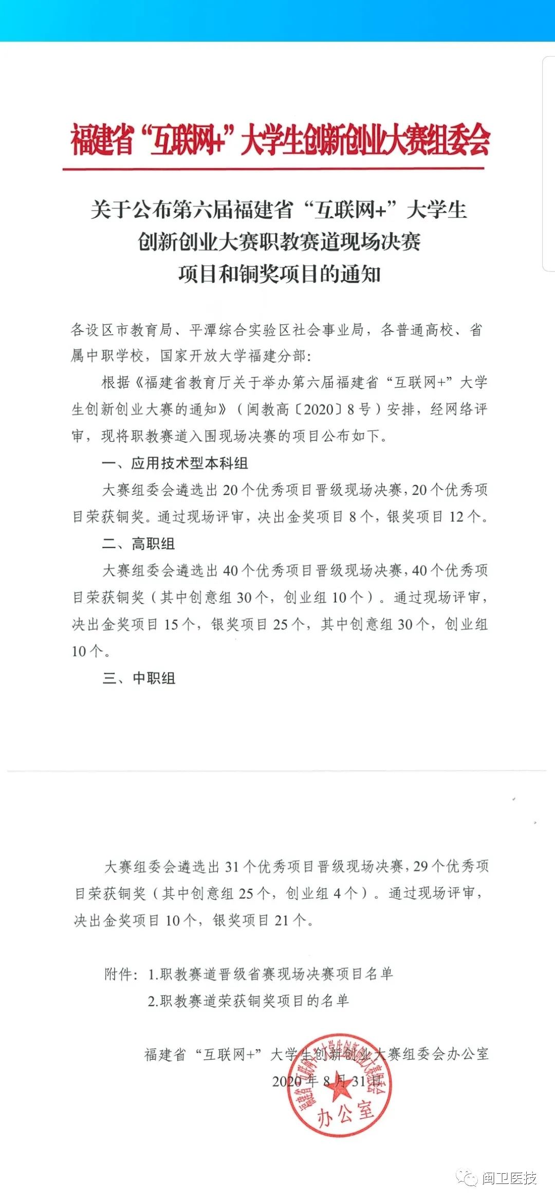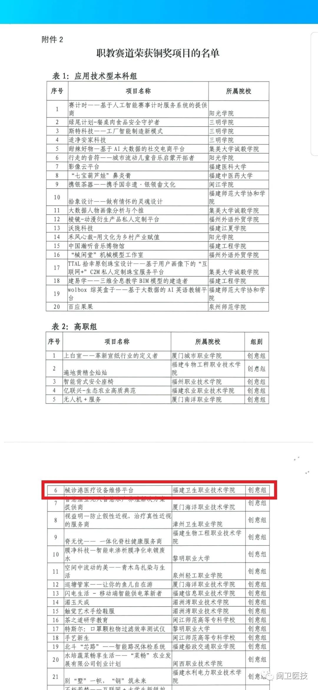 2020年8月31日,第六屆福建省“互聯(lián)網(wǎng)+”大學生創(chuàng)新創(chuàng)業(yè)大賽職教賽道暨第四屆黃炎培海峽職業(yè)教育創(chuàng)新創(chuàng)業(yè)大賽省級初賽網(wǎng)評結(jié)果公布,我院《械診港醫(yī)療設(shè)備維修平臺》項目榮獲省級銅獎。該項目由醫(yī)學技術(shù)系18影像303班林詩婷、19檢驗301班邱倩玉、17設(shè)備301班盧敏、17設(shè)備301班鐘林玉、19設(shè)備301班劉紫嫻、18影像303班朱麗敏、17投資學謝同心(師大協(xié)和學院)等七位同學共同,醫(yī)學技術(shù)系鐘偉雄老師主要指導。