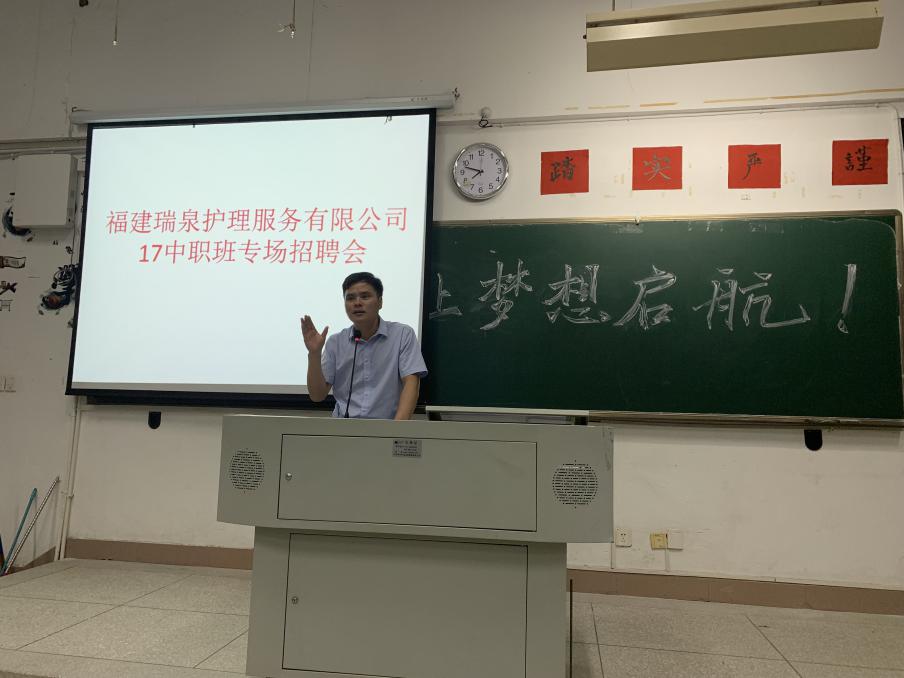 福建省瑞泉護理服務有限公司作為精準扶貧校企合作方之一,三年來也一直關注著精準扶貧班學生的成長,在本次培訓中,瑞泉公司也派專員來到班級,為學生們提供就業(yè)指導,提供就業(yè)兜底保障。