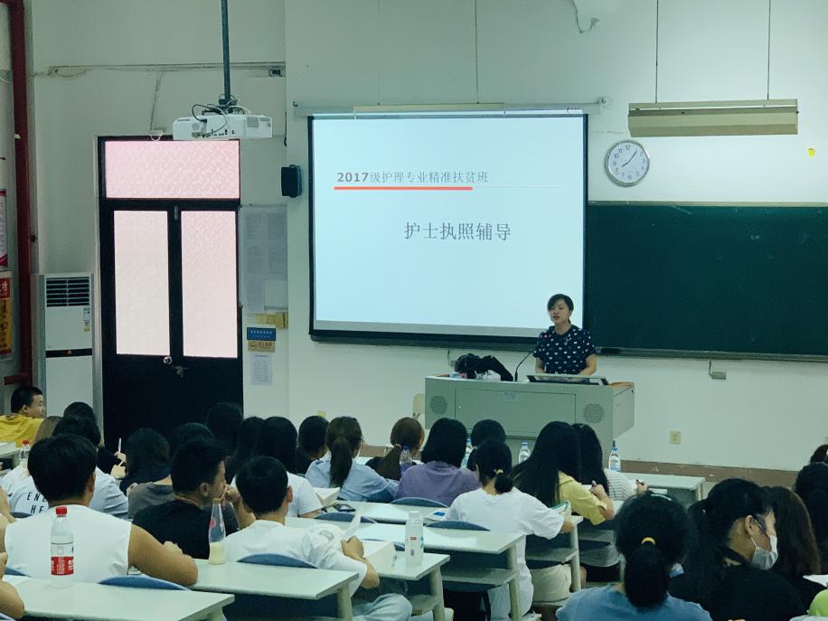 9月秋季開學后,護理系開展了為期一周的護考線下培訓,為精準扶貧班學生進行考前強化輔導。謝濤與龔海蓉兩位系部領導親自指揮,組織培訓團隊制定培訓計劃。