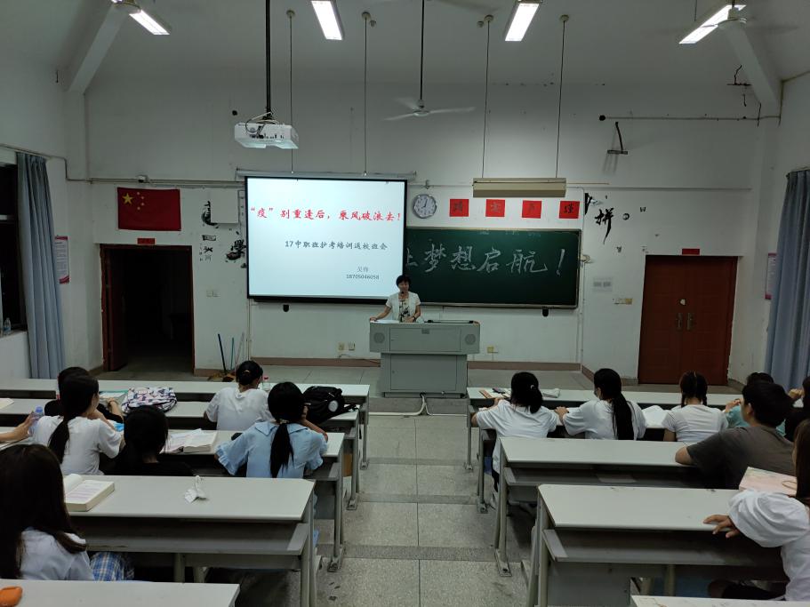 學生返校當天,迅速召開“17級護理中職班護考培訓”動員大會,對同學參加線下培訓提出殷切希望和具體要求。