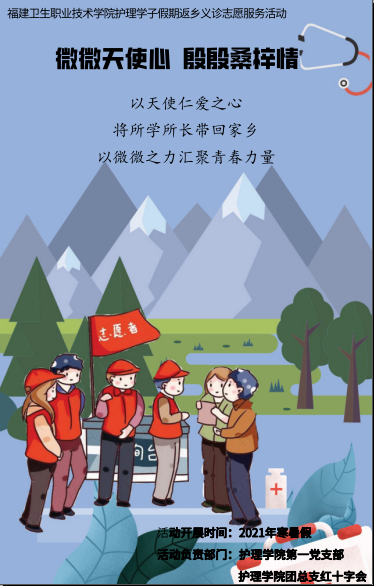 為充分發(fā)揮高校“雙帶頭人”教師黨支部在黨建、學(xué)術(shù)方面的獨特優(yōu)勢,做好黨支部帶頭引領(lǐng)作用與戰(zhàn)斗堡壘作用,同時增強共青團帶領(lǐng)青年在經(jīng)濟社會發(fā)展中發(fā)揮生力軍和突擊隊作用,弘揚紅十字會的人道、博愛、奉獻精神。我校護理學(xué)院第一黨支部協(xié)同護理學(xué)院團總支紅十字會開展返鄉(xiāng)志愿服務(wù)活動,組織護理學(xué)子在2020年寒假返鄉(xiāng)期間,發(fā)揮護理專業(yè)的知識與技能,在家鄉(xiāng)開展志愿服務(wù)活動,反哺家鄉(xiāng)的養(yǎng)育之恩,弘揚白衣天使的仁愛奉獻精神。