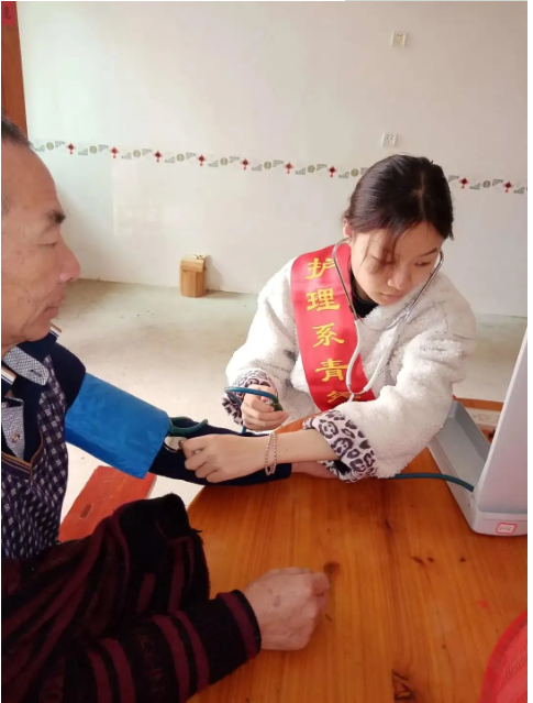 高血壓是危害全人類的常見慢性病,高血壓患病人數(shù)不僅多,而且呈現(xiàn)逐年增高及年輕化趨勢,但有些老年人因為行動和交通不便等各種因素,導(dǎo)致無法外出定期監(jiān)測血壓,還有部分人群從未測量過血壓。本次返鄉(xiāng)志愿服務(wù)活動,護理學(xué)子們持著學(xué)校開具的介紹信,在當(dāng)?shù)叵嚓P(guān)部門的同意和支持下,或在村口、衛(wèi)生院等設(shè)置血壓測量點,或挨家挨戶的入戶為鄉(xiāng)親們測量血壓,講解血壓相關(guān)知識。微微關(guān)懷融化冬日的寒冷,鄉(xiāng)民們受益了,對護理學(xué)子來說,是“助人”,亦是“自助”。