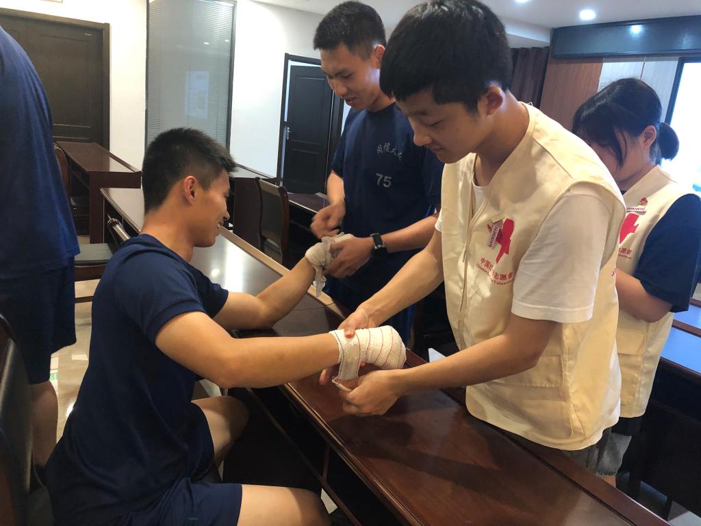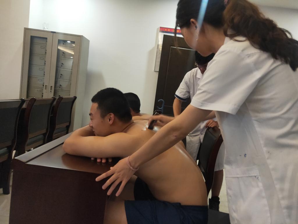 活動(dòng)開(kāi)始,由醫(yī)學(xué)系紅十字會(huì)負(fù)責(zé)人王婷同學(xué)為消防員們?cè)敿?xì)講解繃帶三角巾包扎法的理論知識(shí),其余同學(xué)依次演示急救中常用的頭部、胸部、手部、膝蓋等部位的三角巾包扎手法。隨后,消防員們兩人一組在同學(xué)們的指導(dǎo)下進(jìn)行包扎實(shí)踐訓(xùn)練。最后,師生現(xiàn)場(chǎng)為消防員們提供刮痧拔罐義診活動(dòng)。