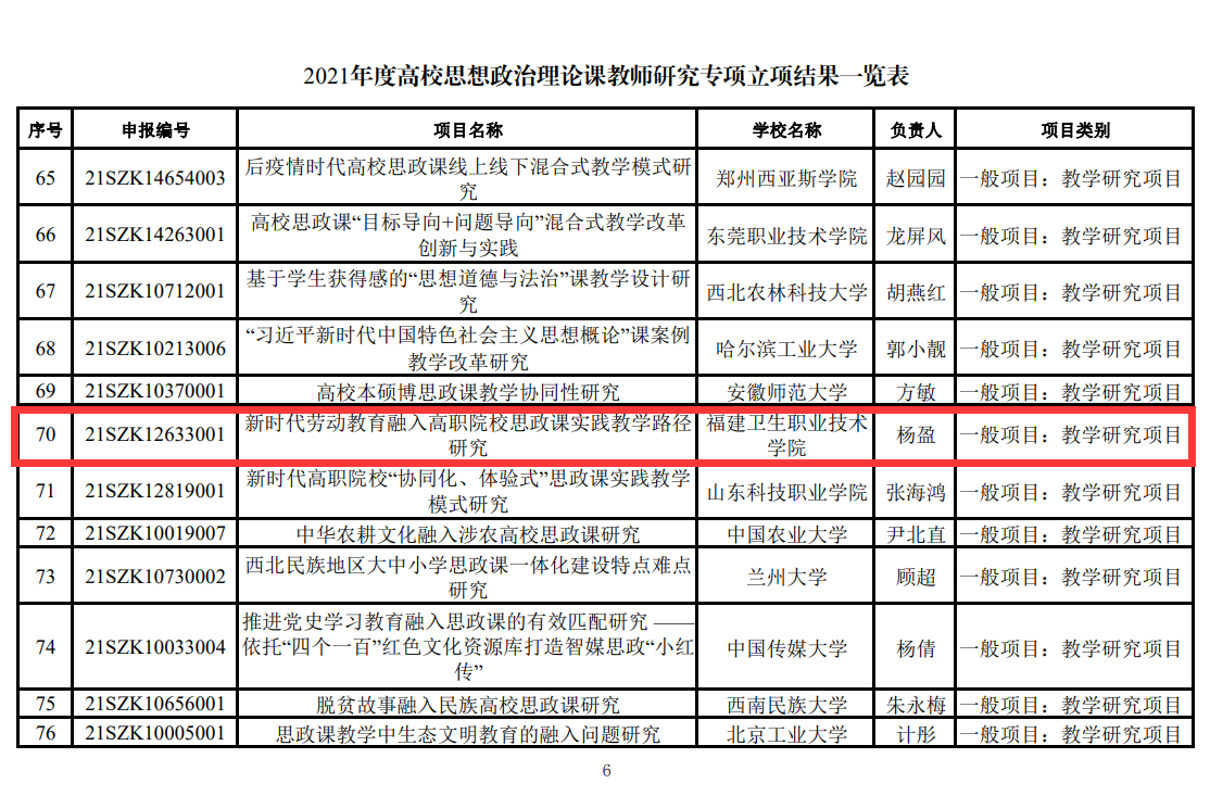 教育部高校思想政治理論課教師研究專項(xiàng)是“高校哲學(xué)社會(huì)科學(xué)繁榮計(jì)劃專項(xiàng)”的重要內(nèi)容,納入教育部人文社會(huì)科學(xué)研究項(xiàng)目。2021年度高校思想政治理論課教師研究專項(xiàng)共立項(xiàng)169項(xiàng)課題,全國高職院校入選項(xiàng)目僅37項(xiàng),我校為福建省高職院校唯一獲批立項(xiàng)單位。