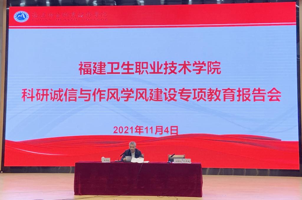 為進(jìn)一步弘揚(yáng)求真務(wù)實(shí)的學(xué)術(shù)精神,營造風(fēng)清氣正的良好科研生態(tài),2021年11月4日,我校在學(xué)術(shù)報(bào)告廳舉辦科研誠信與作風(fēng)學(xué)風(fēng)建設(shè)專項(xiàng)教育報(bào)告會(huì)。本次報(bào)告會(huì)邀請(qǐng)福建省誠信促進(jìn)會(huì)黨委副書記林鴻堅(jiān)、福建省誠信促進(jìn)會(huì)副會(huì)長黃開良來校講座。校長許能鋒、黨委副書記李美華、紀(jì)委書記游鋒、副校長鄭翠紅、全體中層干部、專業(yè)帶頭人、教研室主任、各院系教師代表參會(huì),會(huì)議由鄭翠紅主持。
