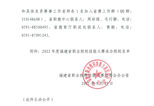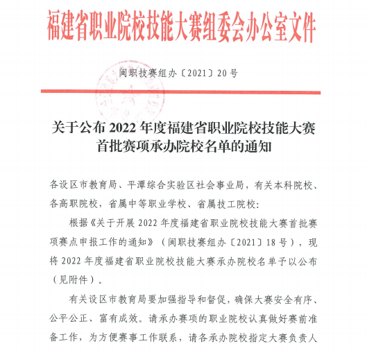 根據(jù)《關(guān)于公布2022年度福建省職業(yè)院校技能大賽首批賽項承辦院校名單的通知》(閩職技賽組辦〔2021〕20號),我校獲批2022年度福建省職業(yè)院校技能大賽首批三個賽項承辦院校。