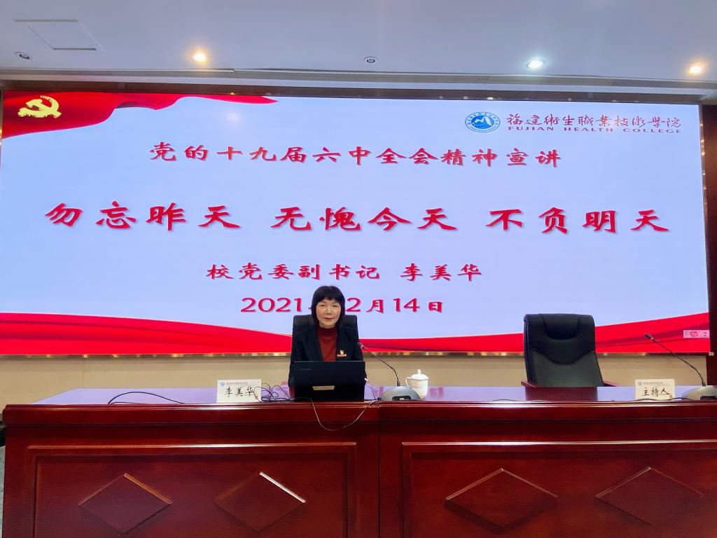 為深入學(xué)習(xí)宣傳貫徹黨的十九屆六中全會(huì)精神,12月14日,校黨委副書(shū)記李美華為聯(lián)系班級(jí)學(xué)生和護(hù)理學(xué)院黨員教師共145人宣講黨的十九屆六中全會(huì)精神。