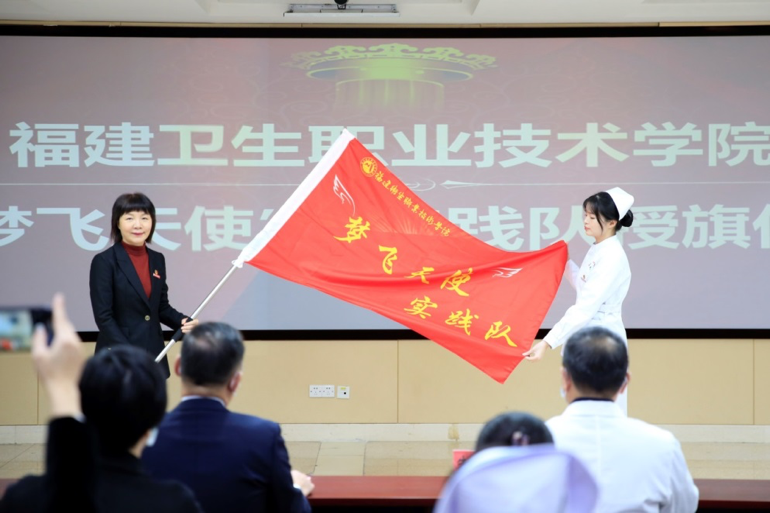 李美華授予護理學院“夢飛天使”實踐隊隊旗,希望“夢飛天使”實踐隊的同學們能弘揚偉大的抗疫精神,堅定信心、增強斗志,意氣風發(fā)地投身福建醫(yī)藥衛(wèi)生事業(yè)發(fā)展,為新發(fā)展階段新福建建設(shè)作貢獻。