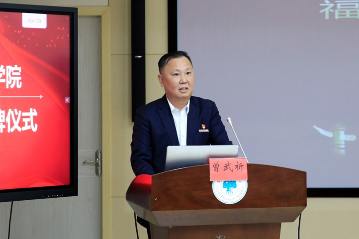 曾武祈代表學校向福建省立醫(yī)院授予“福建衛(wèi)生職業(yè)技術(shù)學院實踐育人示范基地”的牌匾。
