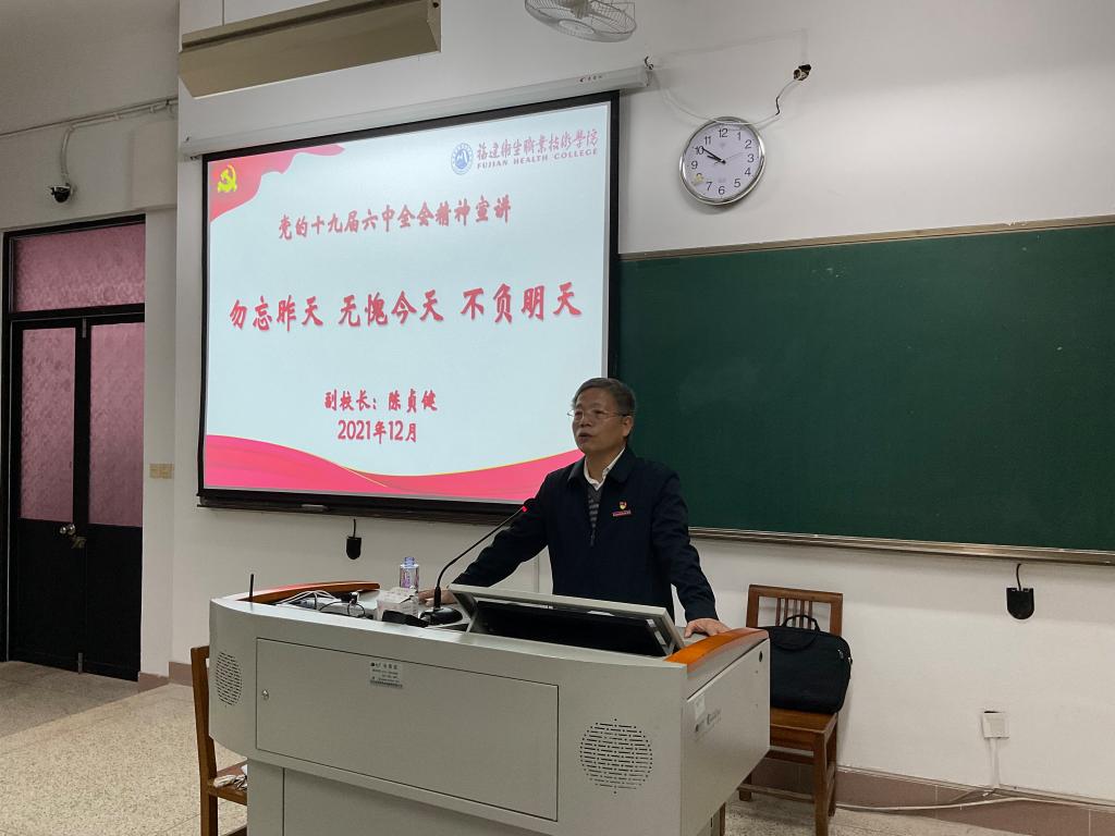 為深入學(xué)習(xí)貫徹黨的十九屆六中全會(huì)精神和福建省第十一次黨代會(huì)精神,12月17日上午,副校長(zhǎng)陳貞健在教學(xué)樓110教室為21級(jí)美容專業(yè)105名師生宣講黨的十九屆六中全會(huì)精神。