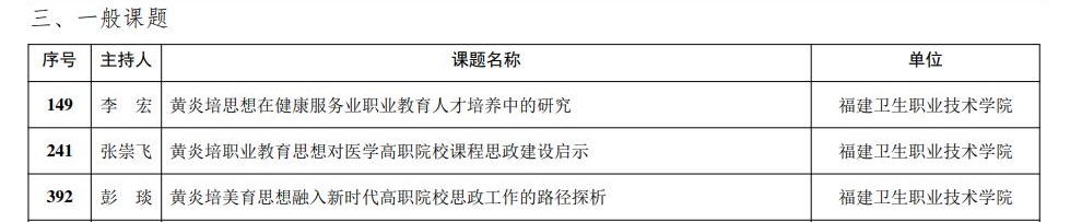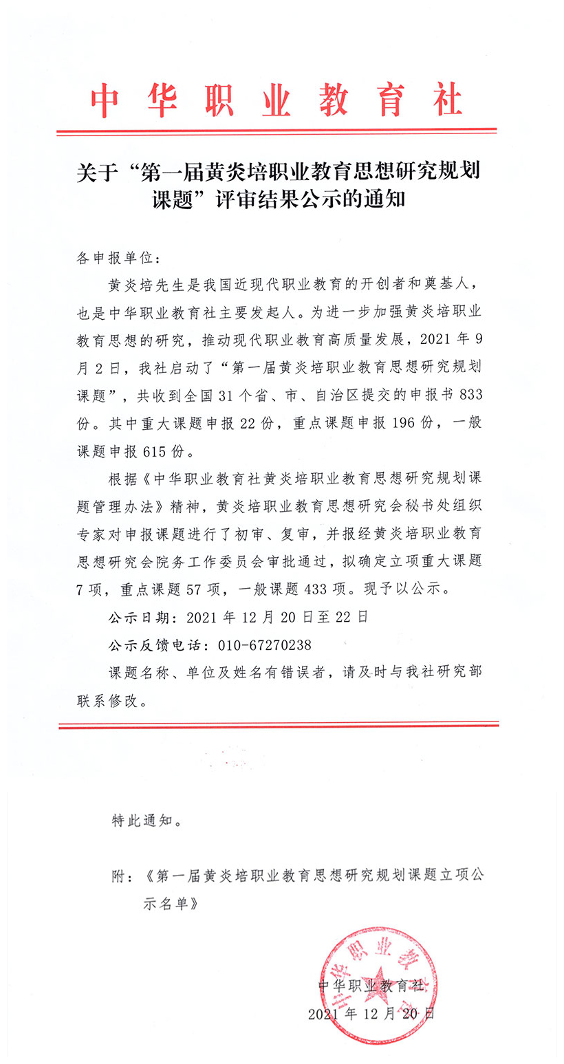 根據中華職業(yè)教育社《關于“第一屆黃炎培職業(yè)教育思想研究規(guī)劃課題”評審結果公示的通知》,我校三項課題獲一般課題立項。