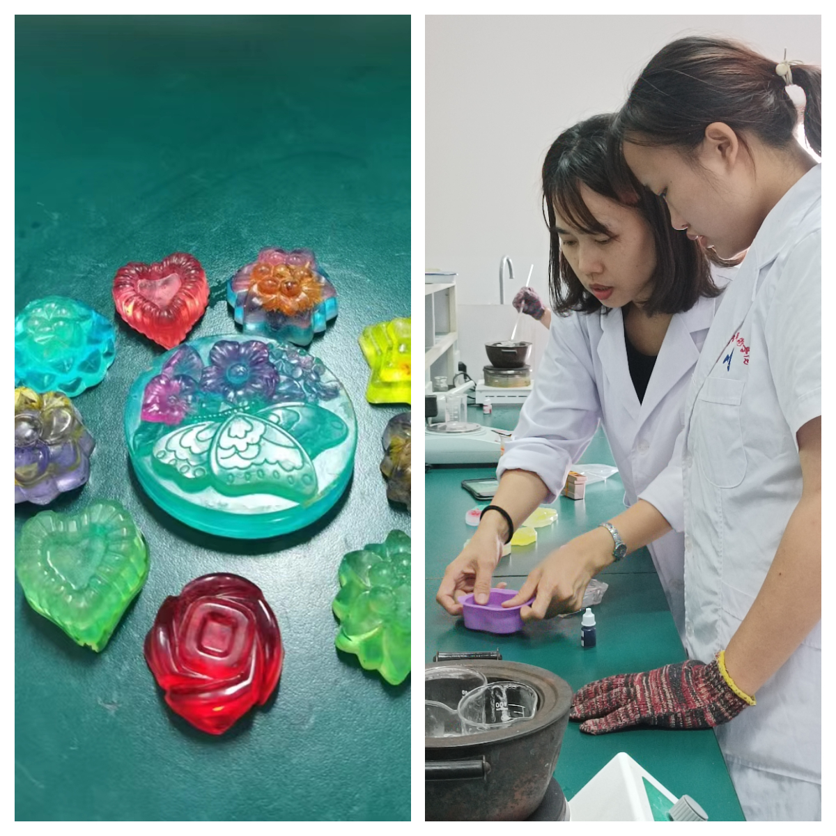 在手工皂制作環(huán)節(jié),張麗華老師一邊介紹制作步驟,一邊示范操作,反復(fù)強(qiáng)調(diào)制作中的注意事項(xiàng)?,F(xiàn)場(chǎng)學(xué)生表現(xiàn)出了極大的熱情,選擇自己喜歡的模具和顏色,將制成的手工皂液,倒入模具內(nèi),冷卻、凝固、脫模。手工皂五彩繽紛、形態(tài)各異,其中有不少作品得到了老師的高度認(rèn)可。