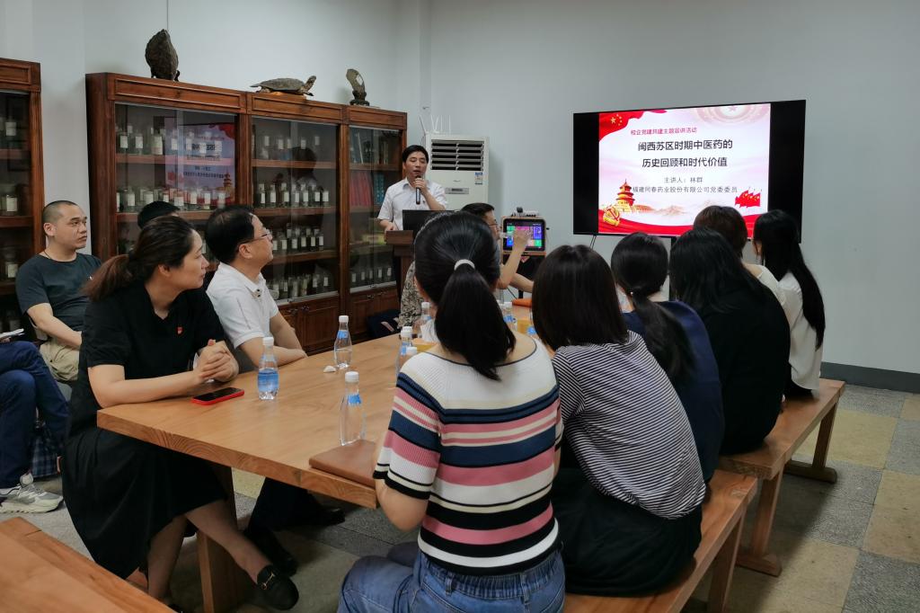 活動伊始,福建同春藥業(yè)股份有限公司黨委委員、福州同春中藥有限公司董事長林群以《閩西蘇區(qū)時期中醫(yī)藥的歷史回顧和時代價值》為主題給全體黨員上了一堂精彩的黨課。林群詳細講述了中醫(yī)藥在中央蘇區(qū)(福建)所發(fā)揮出的重要作用與力量,以及軍隊在缺醫(yī)少藥、衛(wèi)生條件落后的狀況下,依靠群眾,不畏困難,開拓醫(yī)藥衛(wèi)生事業(yè)的奮斗歷程。此次黨課使黨員們對中醫(yī)藥文化有了更深的認識,并激勵大家凝心聚力推動中醫(yī)藥事業(yè)傳承創(chuàng)新發(fā)展。