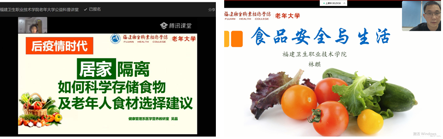 民以食為天,食以安為先。我校健康管理系吳晶和林麒兩位老師分別以《居家隔離如何科學(xué)存儲食物及老年人食材選擇建議》和《看不見的風(fēng)險(xiǎn)——談食品安全與生活》為題,揭開日常生活飲食安全風(fēng)險(xiǎn)面紗,引導(dǎo)老年人科學(xué)存儲食物、科學(xué)選擇食材、科學(xué)健康飲食,普及食品安全知識,守住舌尖上的安全。