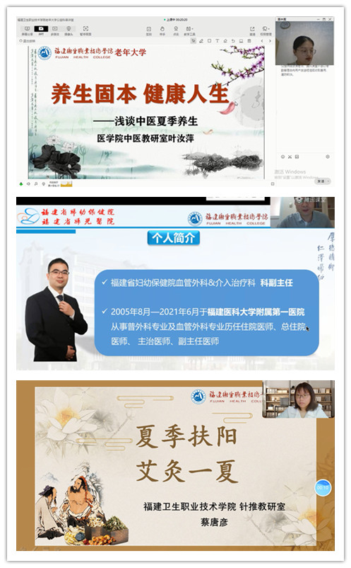 病從淺中醫(yī),預(yù)防最關(guān)鍵。福建省婦幼保健院副主任醫(yī)師詹騰輝及我校醫(yī)學(xué)院葉汝萍、蔡唐彥三位老師分別從《老年人常見血管疾病的防治》《養(yǎng)生固本,健康人生,淺談中醫(yī)夏季養(yǎng)生》《夏季扶陽,艾灸一夏》三個(gè)方面,宣傳健康知識,傳播健康理念,倡導(dǎo)健康生活方式,提高健康素養(yǎng)水平。
