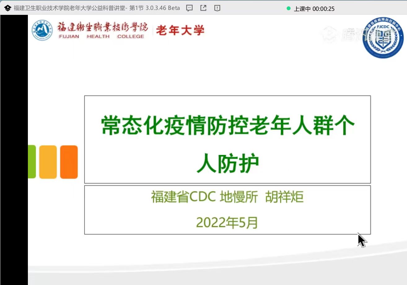 疫情就是命令,防控就是責(zé)任,防控疫情人人有責(zé)。福建省疾病預(yù)防控制中心副主任醫(yī)師胡祥炬以《常態(tài)化疫情防控下老年人群個(gè)人防護(hù)》為題,通過自身支援湖北宜昌,省內(nèi)莆田、寧德、廈門等地一線疫情防控的所見所聞所感,呼吁老年人及時(shí)全程接種疫苗,指導(dǎo)老年人如何做好家庭消毒等科學(xué)有效的預(yù)防措施,確保老年人的身心健康。