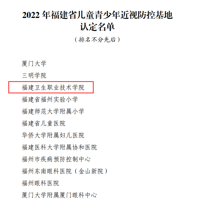近日,福建省教育廳公布2022年全省兒童青少年近視防控基地遴選結(jié)果名單,我校入選首批“福建省兒童青少年近視防控基地”。