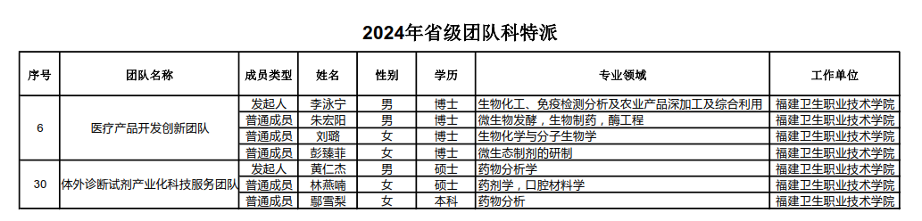近日,福建省科技特派員選認(rèn)結(jié)果公布,學(xué)校黃仁杰、李泳寧、鄧元榮、黃建凡、林勇、張麗華6名教師獲選2024年省級個(gè)人科技特派員;黃仁杰等3名教師組成的“體外診斷試劑產(chǎn)業(yè)化科技服務(wù)”團(tuán)隊(duì)和李泳寧等4名教師組成的“醫(yī)療產(chǎn)品開發(fā)創(chuàng)新”團(tuán)隊(duì)獲選省級團(tuán)隊(duì)科技特派員。學(xué)校省級團(tuán)隊(duì)科技特派員選認(rèn)實(shí)現(xiàn)新的突破。