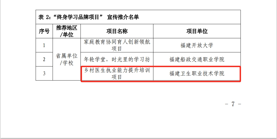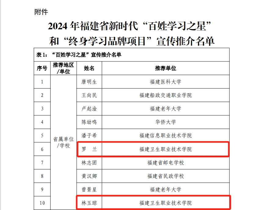 近日,福建省終身教育促進委員會公布2024年福建省新時代“百姓學(xué)習(xí)之星”和“終身學(xué)習(xí)品牌項目”推介名單,我校醫(yī)學(xué)院林玉瓊老師、藥學(xué)院羅蘭老師入選2024年福建省新時代“百姓學(xué)習(xí)之星”;繼續(xù)教育學(xué)院申報項目《鄉(xiāng)村醫(yī)生執(zhí)業(yè)能力提升培訓(xùn)項目》入選2024年福建省新時代“終身學(xué)習(xí)品牌項目”。