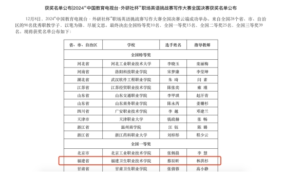 成績詮釋實力,榮譽彰顯努力。蔡辰昕同學憑借扎實的語言基礎、獨特的思考角度和出色的寫作技巧,用英語書寫出自己的青春風采。我校也將繼續(xù)推動英語教學改革、提升教學質(zhì)量,為培養(yǎng)更多符合時代需求的高素質(zhì)技術技能人才貢獻力量。。