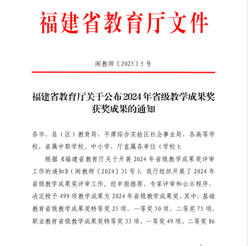 近日,在福建省教育廳公布的2024年福建省職業(yè)教育教學成果獎獲獎名單中,我校憑借卓越的教育教學質量和持續(xù)的教育創(chuàng)新實踐,再度斬獲佳績,榮獲多項獎項,為學校的教育發(fā)展史上增添了濃墨重彩的一筆。