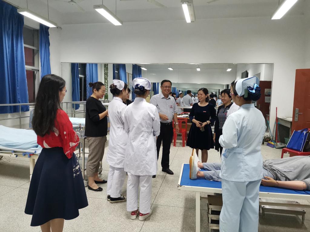 10月23日,學(xué)院黨委曾武祈書記在護(hù)理系黨總支謝濤書記、護(hù)理系龔海蓉副主任的陪同下到護(hù)理系實(shí)訓(xùn)室訓(xùn)練現(xiàn)場(chǎng)看望慰問(wèn)正在備戰(zhàn)全省護(hù)理職業(yè)技能大賽的精準(zhǔn)扶貧班參賽選手。