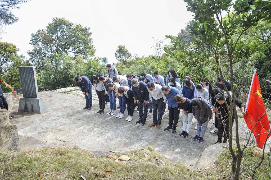 伴隨著旭日的光輝,藥學(xué)院第二黨支部與福建省醫(yī)藥有限責(zé)任公司黨總支的黨員們抵達(dá)降虎寨。踏過青苔斑駁的層層石階,長眠著600多名紅軍英魂的烈士墓靜駐于松林之中。