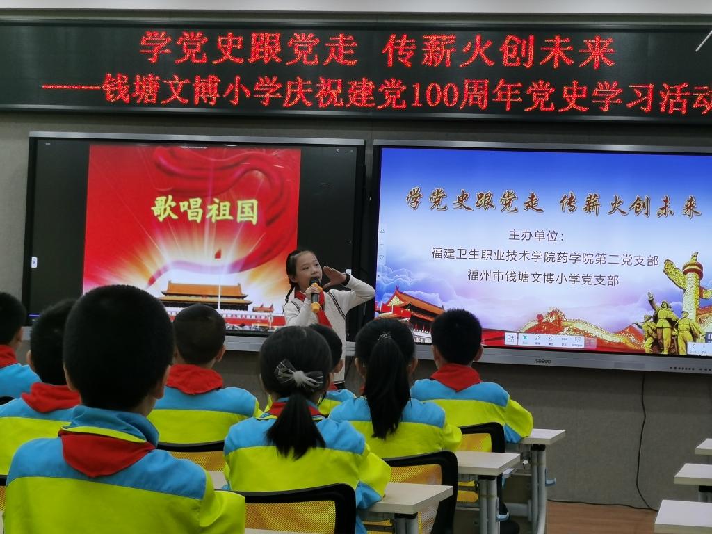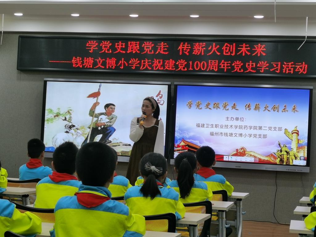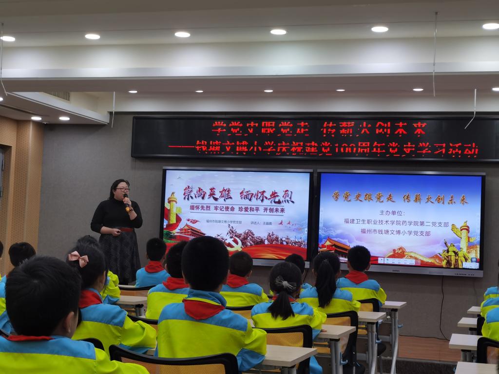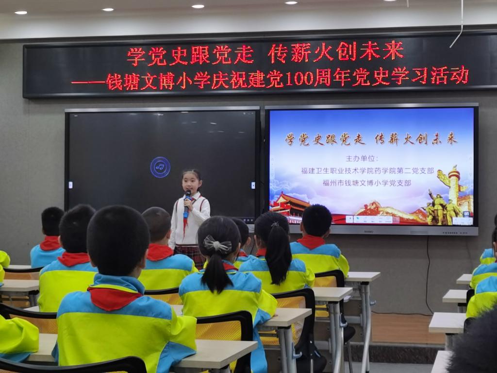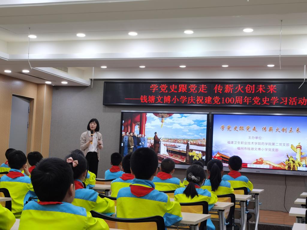 2021年4月16日下午,我校藥學(xué)院第二黨支部與福州市錢塘文博小學(xué)黨支部聯(lián)合開展了以“學(xué)黨史跟黨走,傳薪火創(chuàng)未來”為主題的黨史學(xué)習(xí)教育。其余未能到現(xiàn)場的師生,通過現(xiàn)場直播的方式同步線上參與活動(dòng)。