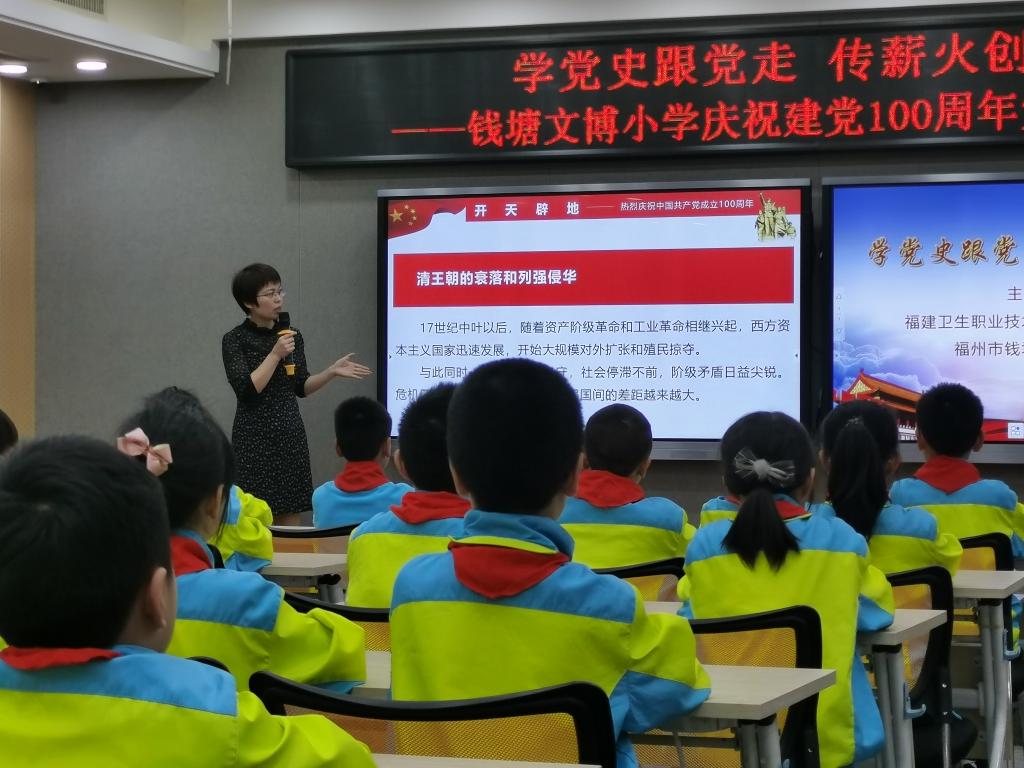 藥學(xué)院第二黨支部書記劉丹丹為錢塘文博小學(xué)的同學(xué)們介紹中國共產(chǎn)黨成立的歷史背景,總結(jié)了中國共產(chǎn)黨人領(lǐng)導(dǎo)中國人民推翻“三座大山”徹底改變中國面貌的豐功偉績,指出了中國共產(chǎn)黨帶領(lǐng)中國人民走出困境的歷史必然性。劉書記激情澎湃的演講點(diǎn)燃了同學(xué)們學(xué)習(xí)黨史的熱情。