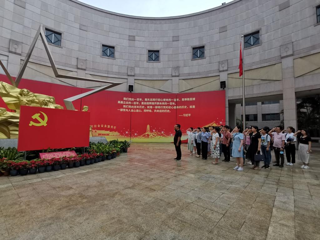 參觀結(jié)束后,全體黨員在革命紀(jì)念館雕像《奮斗》旁,面向鮮紅的黨旗莊嚴(yán)宣誓,重溫入黨誓詞,感悟入黨初心。