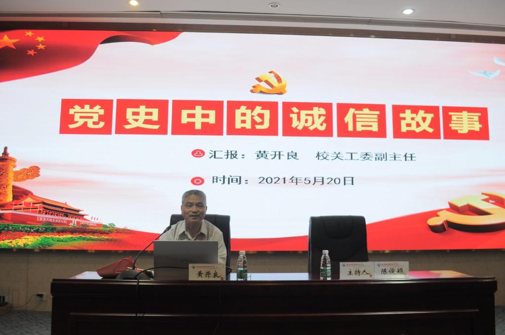 學(xué)校關(guān)工委副主任黃開良為學(xué)員們上分黨校第一課《黨史中的誠信故事》,講述黨的百年奮斗史,宣講黨史中的誠信故事,引導(dǎo)同學(xué)們用黨的奮斗歷程和偉大成就鼓舞斗志、明確目標(biāo)、努力成才。