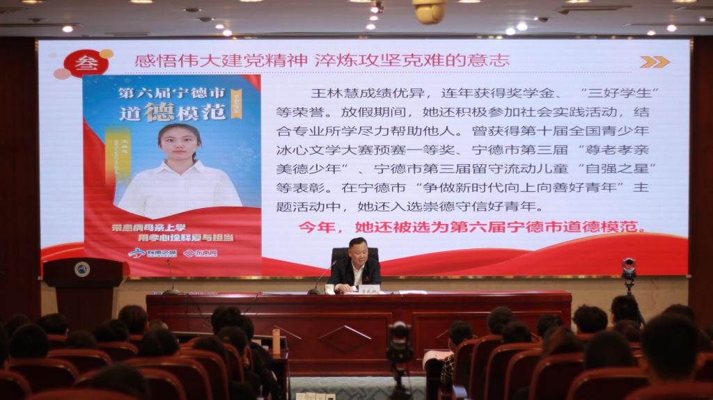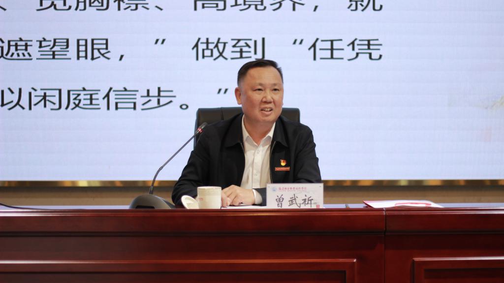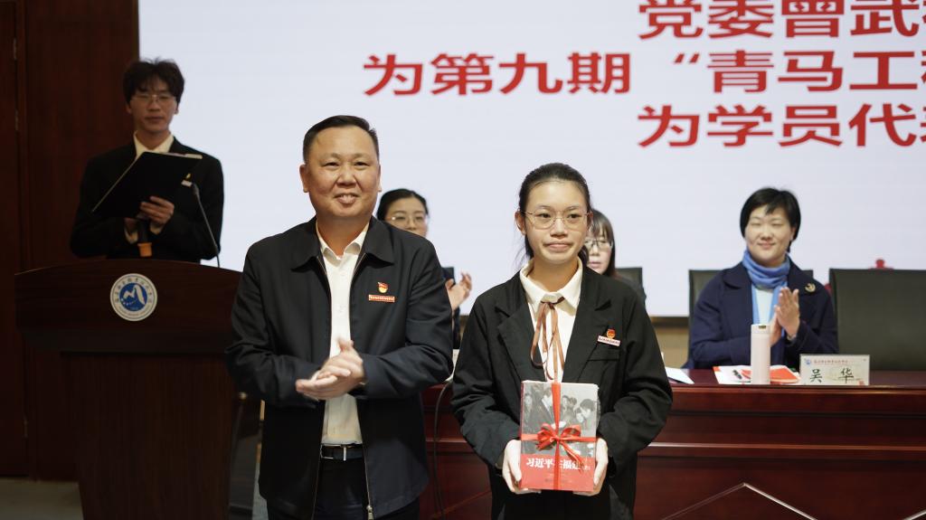 曾武祈為第九期“青馬工程”培訓(xùn)班授旗并贈予學(xué)生代表《習(xí)近平在福建》系列書籍,勉勵青馬學(xué)員從習(xí)近平總書記在閩工作的點(diǎn)點(diǎn)滴滴中磨礪自我,篤定共產(chǎn)主義信仰。