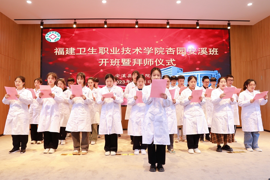 福建衛(wèi)生職業(yè)技術學院校長許能鋒、醫(yī)學院黨總支書記邱滾忠、教務處副處長李淼淼、實習實訓中心副主任梁艷、醫(yī)學院副院長陳銘,安溪縣衛(wèi)生健康局副局長鄭貴陽,安溪縣中醫(yī)院院長李朝暉、黨委書記黃海松及其他領導班子成員,縣中醫(yī)院各職能科室與臨床科室負責人,杏園安溪班指導老師及所有學員參加本次活動。