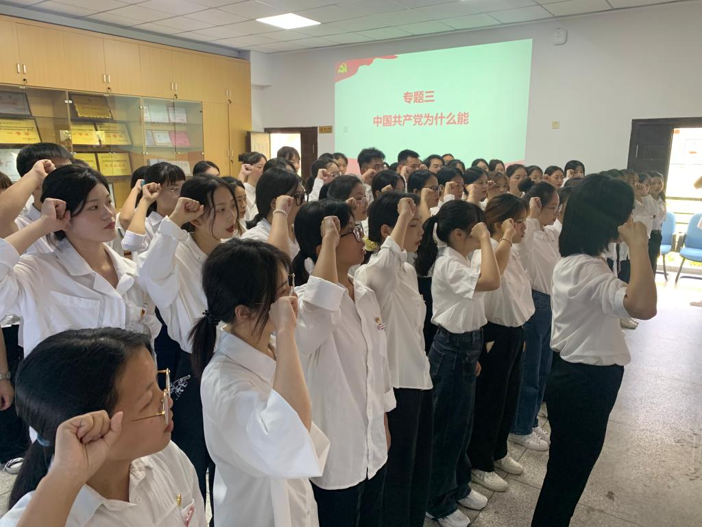 2021年7月5日,藥學(xué)院黨總支組織52名新發(fā)展實(shí)習(xí)生預(yù)備黨員在會(huì)議室開展入黨宣誓。面向鮮紅的中國共產(chǎn)黨黨旗,教師預(yù)備黨員張麗華帶領(lǐng)新黨員舉起右拳莊嚴(yán)宣誓。新黨員們的錚錚誓言,表達(dá)了作為新時(shí)代共產(chǎn)黨員的責(zé)任與擔(dān)當(dāng),也向黨許下了對(duì)黨忠誠、永不叛黨的堅(jiān)定承諾。