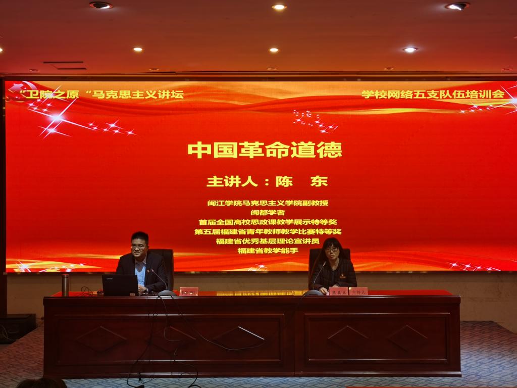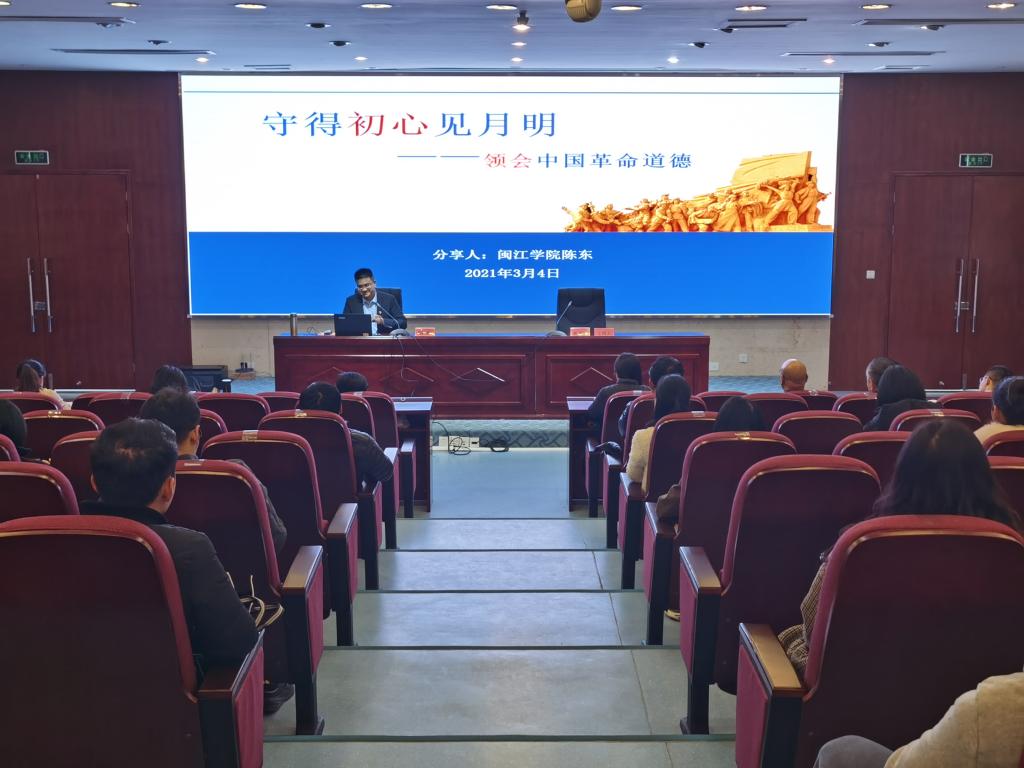 為深入學習習近平新時代中國特色社會主義思想,持續(xù)開展關(guān)于黨史、新中國史、改革開放史、社會主義發(fā)展史教育,深入學習中國革命精神,鞏固提升師生理想信念,2021年3月4日下午,閩江學院馬克思主義學院陳東副教授應(yīng)邀做題為“中國革命道德”專題講座。校黨委宣傳部、學生工作部、團委等部門負責人、各二級院系黨總支書記及副書記、馬院全體專兼職教師和全體輔導(dǎo)員共同領(lǐng)會了中國革命道德的深刻內(nèi)涵。講座由馬克思主義學院院長熊美蘭主持。