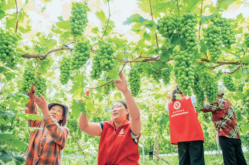近年來,江蘇省宿遷市宿城區(qū)支口街道大力實施黨建引領(lǐng)強村富民工程,采取“黨建+合作社+農(nóng)戶”運作模式,組織黨員志愿者走進(jìn)田間地頭生產(chǎn)一線,引導(dǎo)群眾因地制宜發(fā)展山楂、葡萄等特色產(chǎn)業(yè)種植,拓寬增收渠道,助力鄉(xiāng)村振興。圖為2023年6月30日,在宿遷市宿城區(qū)支口街道探楚社區(qū)葡萄種植基地,黨員志愿者和果農(nóng)一起管護(hù)葡萄。人民圖片 徐江海/攝