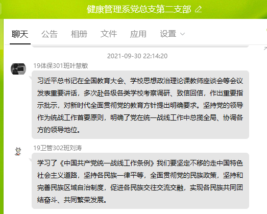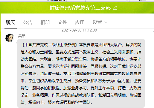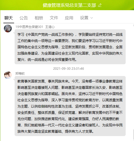 9月30日,健康管理系黨總支第二支部組織全體師生黨員開展專題學(xué)習(xí)交流會(huì),學(xué)習(xí)《關(guān)于深入學(xué)習(xí)宣傳貫徹黨的教育方針的通知》精神、《中國共產(chǎn)黨統(tǒng)一戰(zhàn)線工作條例》及《中共福建省委關(guān)于貫徹<中國共產(chǎn)黨統(tǒng)一戰(zhàn)線工作條例>的實(shí)施意見》。會(huì)議由支部書記張凱捷主持。