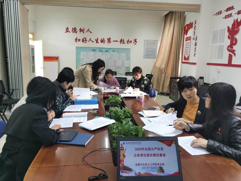 2021年3月26日上午,直屬馬克思主義學(xué)院黨支部在行政樓107會(huì)議室開(kāi)展2020年全面從嚴(yán)治黨主體責(zé)任落實(shí)情況督查工作匯報(bào)會(huì),學(xué)院黨委曾武祈書(shū)記、組織統(tǒng)戰(zhàn)部吳華部長(zhǎng)等督查組成員出席了會(huì)議,直屬馬克思主義學(xué)院熊美蘭書(shū)記及其他支部委員參加了會(huì)議。