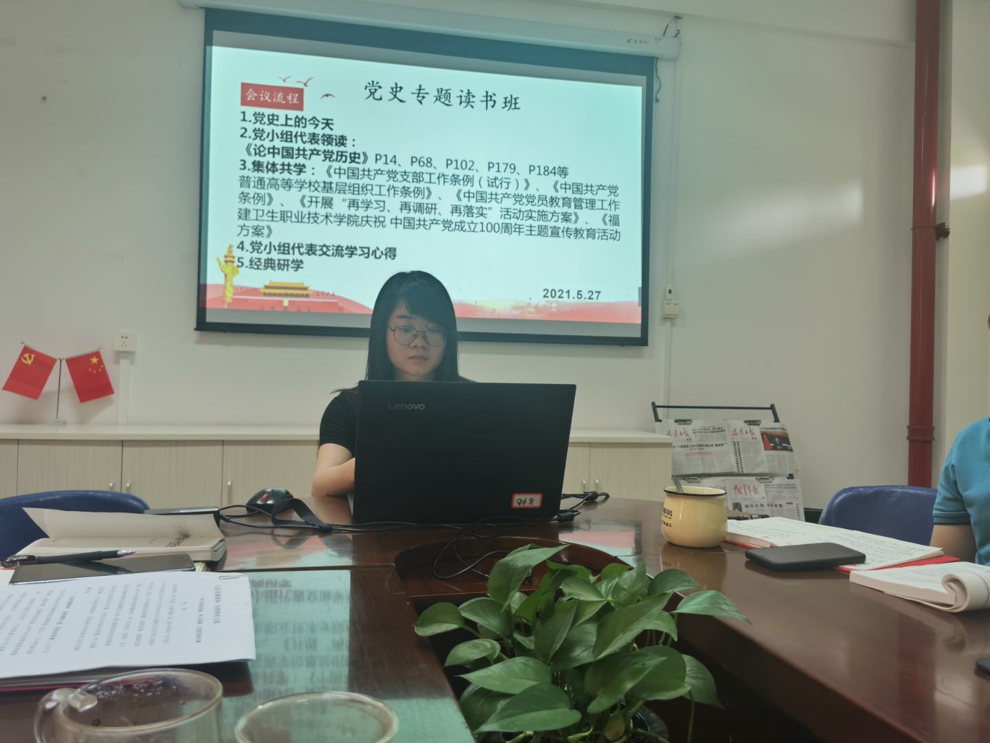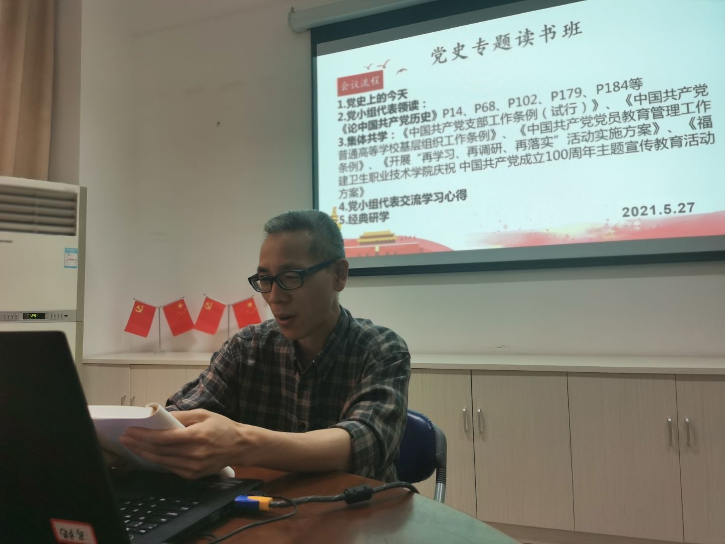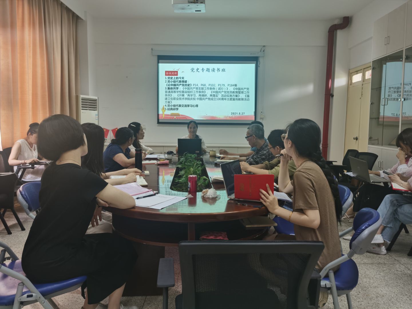為深入學(xué)習(xí)黨史,傳承紅色基因,擔(dān)當(dāng)初心使命,2021年5月27日直屬馬克思主義學(xué)院黨支部第二黨小組在會(huì)議室107進(jìn)行黨史學(xué)習(xí)。學(xué)習(xí)活動(dòng)由黨小組組長(zhǎng)來朋珍主持。