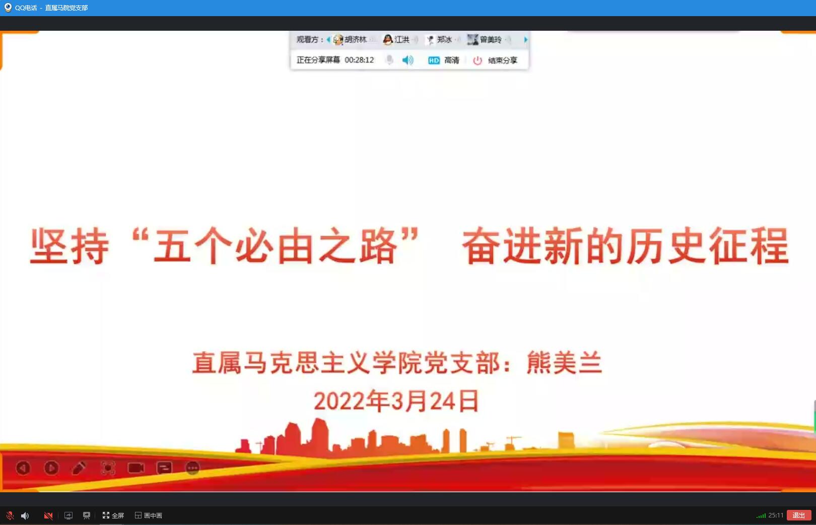 為了更好地學(xué)習(xí)宣傳貫徹兩會(huì)精神,2022年3月24日上午,直屬馬克思主義學(xué)院黨支部熊美蘭書(shū)記通過(guò)QQ群平臺(tái)線(xiàn)上為黨支部作了題為“堅(jiān)持‘五個(gè)必由之路’ 奮進(jìn)新的歷史征程”黨課。支部全體黨員同志參加學(xué)習(xí)。